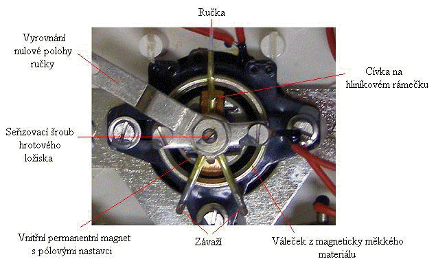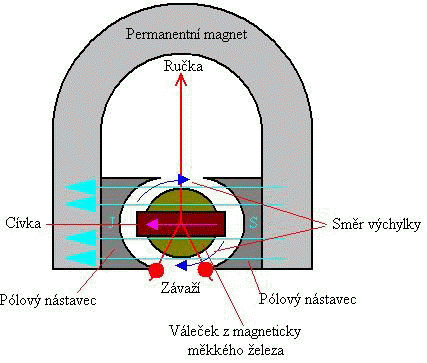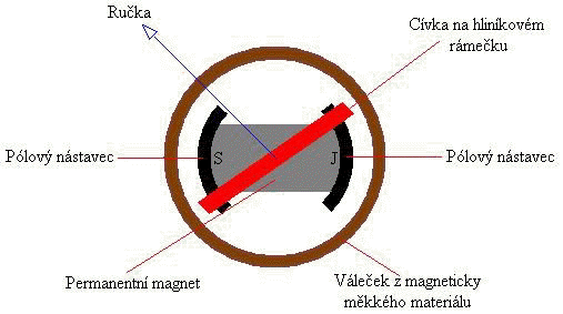 Tato soustava využívá magnetického pole permanentního magnetu, ve kterém se otáčí cívka, spojená s ručkou. Cívkou protéká měřený stejnosměrný proud a tím vzniká vlastní magnetické pole cívky. Lineární výchylka tedy vzniká vzájemným působením magnetických polí magnetu a cívky. Princip soustavy ![]() Cívka je obvykle navinutá na hliníkovém rámečku. Přívod proudu do cívky je proveden přes direktivní ( vratné ) pružiny nebo závěsnými vlákny. Tlumení je magnetické. Hliníkový rámeček tvoří závit nakrátko. Pohybem cívky se v rámečku indukuje napětí opačného směru a tím způsobí „brzdící“ sílu. Magnetoelektrická soustava rozlišuje polaritu měřeného napětí nebo proudu. Na to je nutné při měření dávat velký pozor, protože opačná výchylky, tzv. „za roh“, může způsobit poškození mechanismu.Ve skutečných přístrojích má mechanismus složení jiné. Dnes se využívá tzv. vnitřní malý magnet z kvalitního materiálu, kolem kterého se otáčí cívka. Uložení cívky je buď v hrotových ložiskách s direktivními pružinami nebo na závěsových vláknech. U běžných panelových přístrojů převažuje hrotové uložení. Tlumení je magnetické, indukovanými vířivými proudy v hliníkovém rámečku cívky. Princip praktického provedení