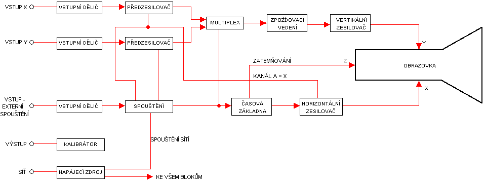 Blokové schéma analogového dvoukanálového osciloskopu