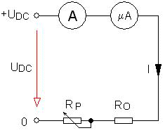 Postupně nastavujeme odpovídající hodnotu napětí na kontrolovaném přístroji a odečítáme přesný údaj na cejchovacím voltmetru. Získané hodnoty zapisujeme do tabulky. Měření je vhodné provést oběma směry výchylky - vzestupně a sestupně. Z naměřených hodnot vypočítáme absolutní chybu a chybu relativní. Porovnáme s třídou přesnosti posuzovaného přístroje. Jestliže zjistíme, že přístroj nevyhovuje - vykazuje na některém měřeném bodu větší chybu - je možné ho používat i nadále. Jen musíme vzít tuto skutečnost v úvahu. Kontrola rozsahu ampérmetru: Schéma zapojení zkušebního obvodu a postup měření: