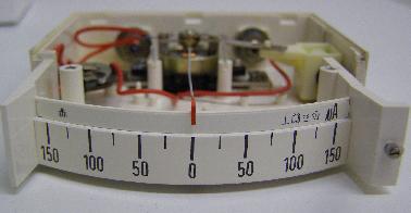Tato soustava využívá magnetického pole permanentního magnetu, ve kterém se otáčí cívka, spojená s ručkou. Cívkou protéká měřený stejnosměrný proud a tím vzniká vlastní magnetické pole cívky. Lineární výchylka tedy vzniká vzájemným působením magnetických polí magnetu a cívky. Princip soustavy ![]() Cívka je obvykle navinutá na hliníkovém rámečku. Přívod proudu do cívky je proveden přes direktivní ( vratné ) pružiny nebo závěsnými vlákny. Tlumení je magnetické. Hliníkový rámeček tvoří závit nakrátko. Pohybem cívky se v rámečku indukuje napětí opačného směru a tím způsobí „brzdící“ sílu. Magnetoelektrická soustava rozlišuje polaritu měřeného napětí nebo proudu. Na to je nutné při měření dávat velký pozor, protože opačná výchylky, tzv. „za roh“, může způsobit poškození mechanismu.Ve skutečných přístrojích má mechanismus složení jiné. Dnes se využívá tzv. vnitřní malý magnet z kvalitního materiálu, kolem kterého se otáčí cívka. Uložení cívky je buď v hrotových ložiskách s direktivními pružinami nebo na závěsových vláknech. U běžných panelových přístrojů převažuje hrotové uložení. Tlumení je magnetické, indukovanými vířivými proudy v hliníkovém rámečku cívky. Princip praktického provedení