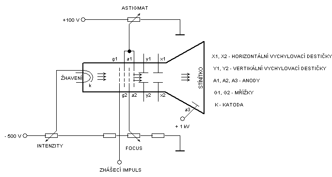 Analogový osciloskop Osciloskop můžeme charakterizovat jako měřicí přístroj, který měřené napětí také zobrazuje jako stopu na stínítku obrazovky. Osciloskop zapojujeme do měřicího obvodu jako voltmetr. Takže jeho vstup musí mít velký vstupní odpor. V praxi se většinou jedná o hodnotu 1 MΩ. Vstupní kapacita musí být co nejmenší, většinou bývá kolem 20 pF. Pro měření napětí na vysokých kmitočtech je důležitá kompenzace vstupního děliče. Pro odečítání měřených hodnot ( napětí a času ) jsou vstupní děliče ( napěťový a časová základna ) kalibrované. Hodnoty jsou udány v hodnotě / dílek. V podstatě se jedná o měřicí konstantu pro daný rozsah. Stupnici zde představuje stínítko obrazovky, které je rozděleno čtvercovým rastrem na dílky. Analogové osciloskopy mívají 8 – 10 dílků vodorovně a 6 -8 dílků svisle. Obrazovky analogových osciloskopů se od obrazovek televizních podstatně liší. Hlavní rozdíl je ve způsobu vychylování paprsku. U televizních obrazovek je vychylování elektromagnetické. Tento princip je daleko účinnější, ale je omezený kmitočtovým rozsahem. Kdyby osciloskopy tento způsob používaly, nemohly by měřit napětí o vysokých kmitočtech. Projevovaly by se negativně velké indukčnosti vychylovacích cívek. U analogových osciloskopů se tedy používá vychylování paprsku elektrostatické. Nevýhodou je malý vychylovací úhel. Proto osciloskopické obrazovky větších rozměrů jsou delší a zvětšují rozměry celého přístroje. Obrazovky jsou vzduchoprázdné, letící elektrony na žádné částice nemohou narážet a měnit směr. Stínítko tvoří vrstva luminoforu, která náraz elektronu přemění na světelný záblesk. Tyto vrstvy mají u současných osciloskopů nazelenalou nebo namodralou barvu. Vrstva luminoforu, zrovna jako katoda, není nevyčerpatelná. Životnost je omezená. Proto je nutné, jestliže není přístroj v měřicím režimu, snižovat jas . Osciloskopy většinou využíváme v režimu YT, to je pozorování a měření časového průběhu napětí nebo v režimu XY, to je vzájemné pozorování dvou vstupních signálů s vypnutou časovou základnou. Obrazovka v podstatě pracuje na principu elektronky. Svazek elektronu vzniká na žhavící elektrodě – katodě. Dále letí sestavou mřížek a urychlovacích anod, které ho formují a ztenčují ( ASTIGMAT ), zaostřují ( FOCUS ), zjasňují ( INTENZITY ) a urychlují. Vychylovací destičky slouží pro vychylování paprsku svisle a vodorovně, aby tvořil požadovanou stopu po dopadu na stínítko. Zhášecí impuls je přiváděn pro zhasnutí stopy při návratu paprsku do výchozího bodu. Orientační schéma obrazovky analogového osciloskopu.